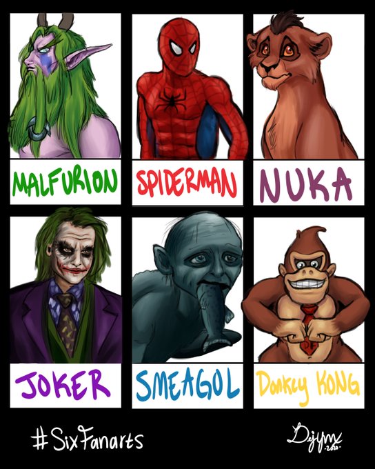 #SixFanartsChallenge Have someone randomly pick 6 characters and draw them! Mine were picked by @HeartIshara. I think Joker and Smeagol are my fav.