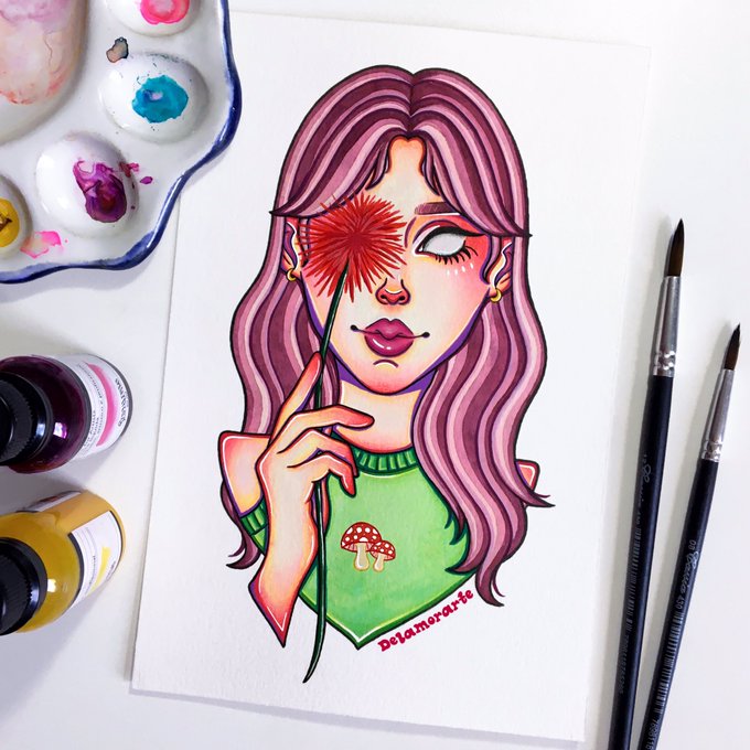 Sou a Mari (ou Dêla), sou ilustradora e trabalho principalmente com aquarela, guache e também faço ilustras digitais 💜