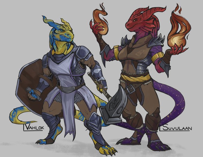 @hoozboozcrooz Blue one is @/DraenethDragon , combat is @/taldret and @/CrucibleArt again, big yellow is @/Myriaderoc , dragonborn twins are a private client whom I can't quite recall if she's on Twitter or not but are for a D&D campaign.
