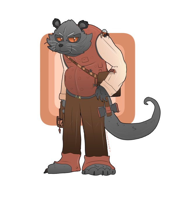 Commission for bookscoffeeandblankets on Tumblr- their Binturong Tabaxi Artificer, Brass- a grumpy old soul with a quick wit and two mechanical bugs to give him a hand and a grooming! #commissionsopen #Commission #DnD