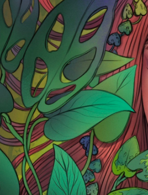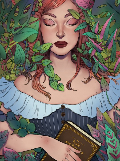 The foliage in this piece is beautifully done, framing the character with intricate shapes.
