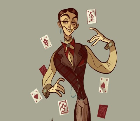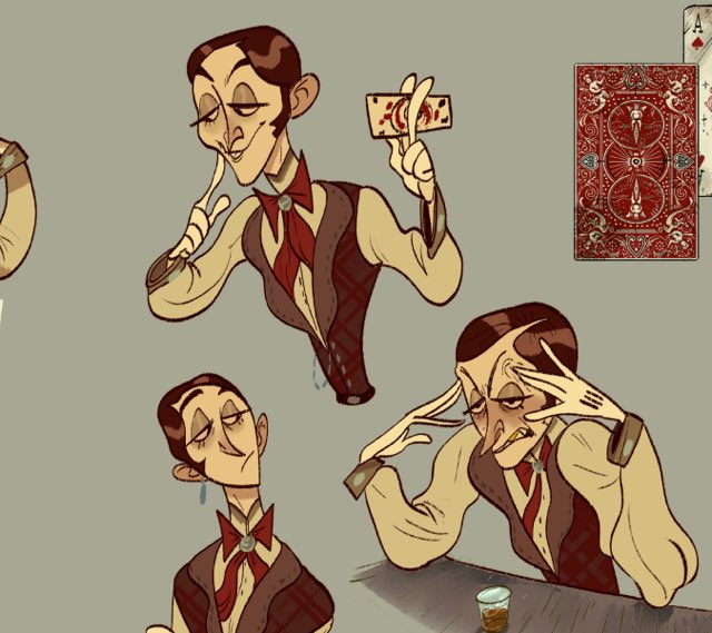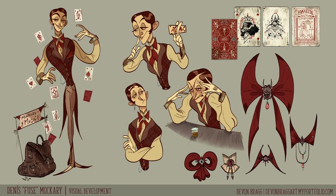 The conman magician Fuse Mockary’s character sheet for visual development along with some of his cards. #characterdesign #magic #characters #ocs #devonbragg