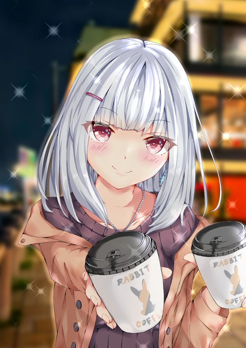 コーヒーを渡してくれるフワッとした髪型の女の子描きました。