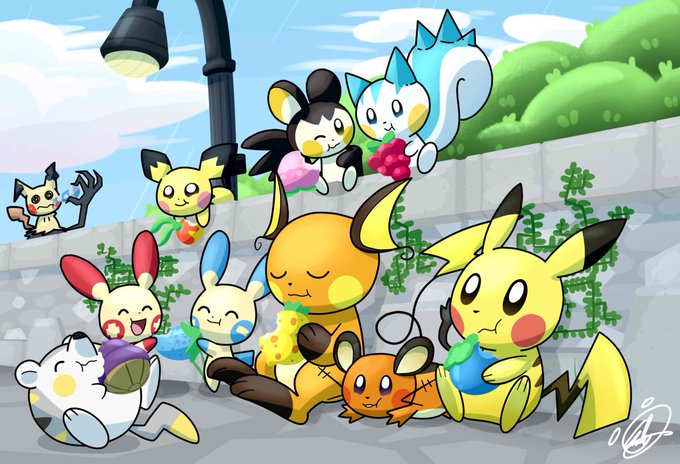#Pichu, #Pikachu, #Raichu and #Mimikyu hanging out and eating together with #Plusle, #Minun, #Pachirisu, #Emolga, #Dedenne and #Togedemaru.