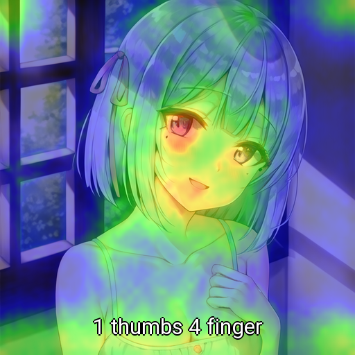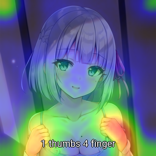 (1 thumbs 4 finger:1.0), (5 finger:1.0) の場合、5 fingerは指、1 thumbs 4 fingerは手に効いている印象