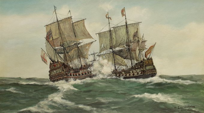 Oil on board painting of a good old set to with the Spanish. The British ship reminds me of HMS Sophie.