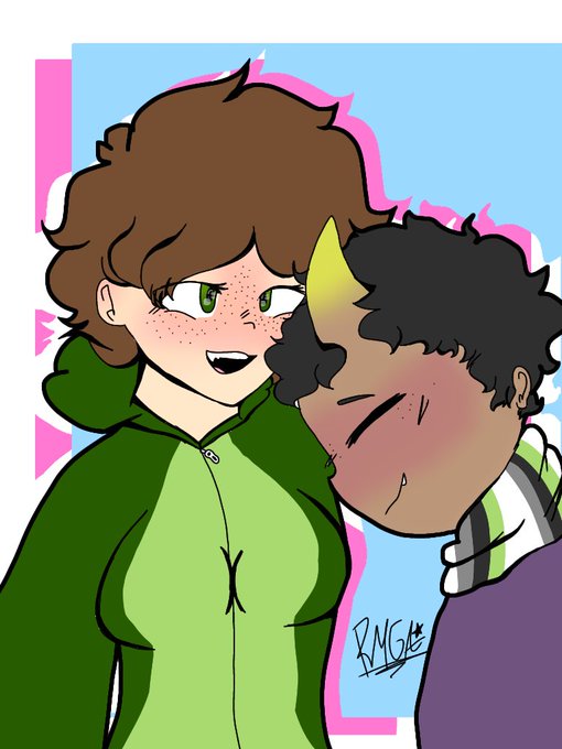 @rule34_ooc Ella es flor y el otro es su novio se llama pato, Pati es alto es mitad demonio y angel Los cuernos no son de ese color (usualmente son negros) y tiene alas