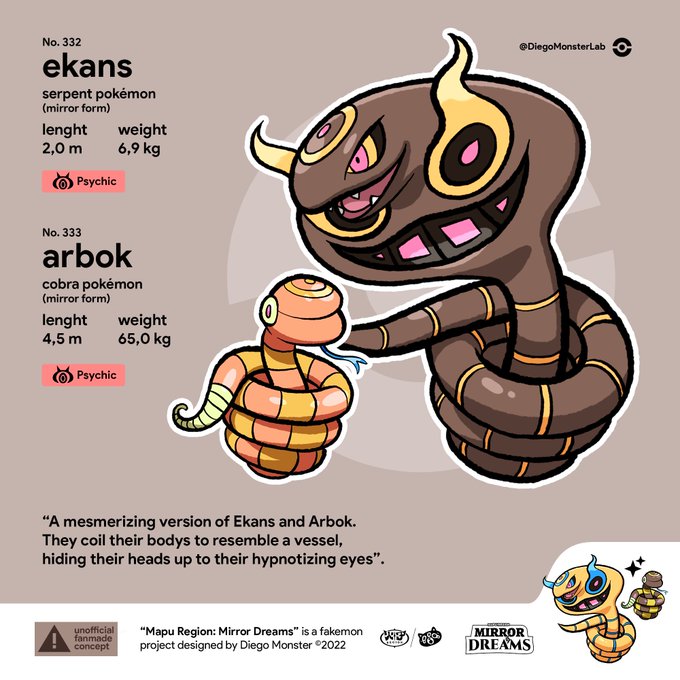 Here are more 'mirror versions' from my #fakemon project 'Mirror Dreams', Ekans, Venonat and Psyduck✨