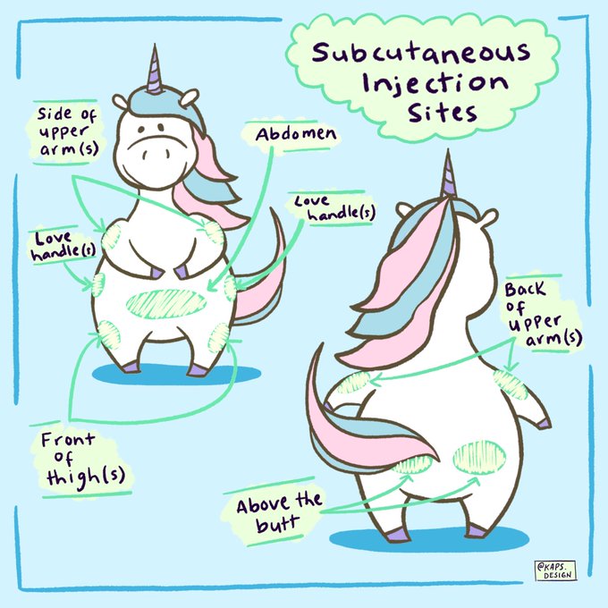 Where do I inject those SQ hormones? Anywhere aon this diagram you can #PinchAnInch of body tissue! #AllAboutHormonesMonth #HRT #TransHealth #NonBinaryHealth