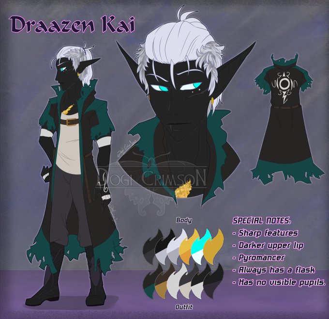 Here's my boy Draazen Kai, runaway draconic sorcerer, who's trying to make up for all the things he did during a war the drow started. Not that anyone knows that, he acts like a tired prick.