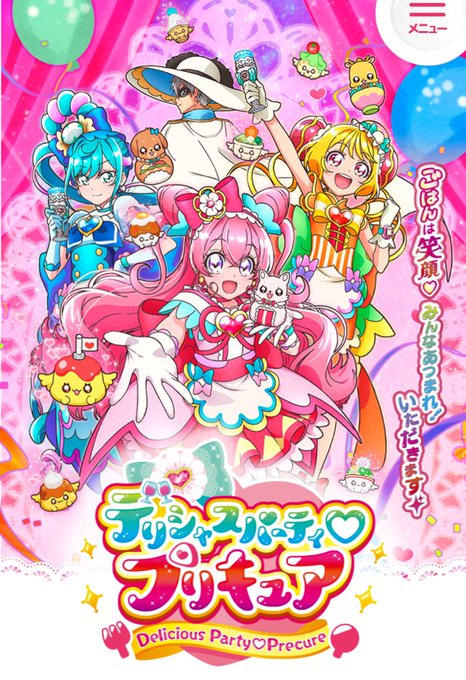 はい天才 ピンク髪ツインテは正義なんよな 紫眼なのもかなりポイント高め 周りに寿司が浮いてるあたり600億万点だね みんな中2なのもめっちゃ良き 3人で ご飯 パン 麺 って感じか? 衣装はエプロン感あっていい感じ デリシャスマイル〜!は今年の流行語間違いなしやね #デリシャスパーティプリキュア