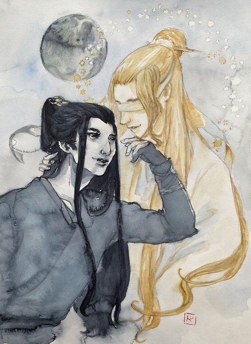 Some art nuveau style for Yi city. You can read it as XXC being the light of moon and stars, while XY is darkness of the night and space. #xiaoxingchen #xueyang #xuexiao #yicityarc #mdzsfanart #watercolorart