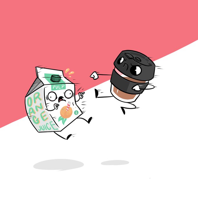 I decided to redraw an old illustration I did a few years ago (coffee fighting the orange juice) and update the style and the energy lol. It’s cool to look back and see the ways my techniques have evolved over the years.