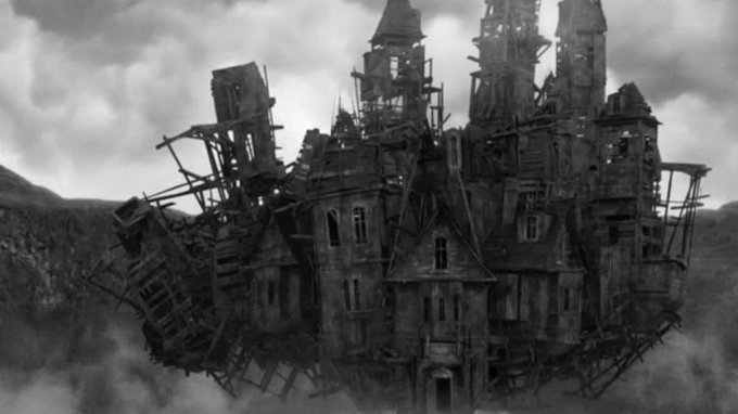 Screen of that messed up house from "War of the Sontarans" vs a painting by Daryl Joyce from the ancient BBC eBooks version of Marc Platt's "Lungbarrow".