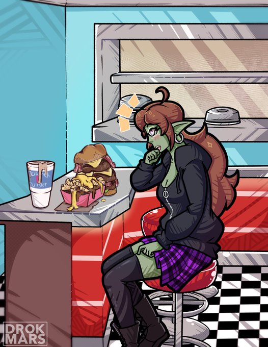 Commission for a client without a Twitter, featuring their Gobbo getting ready to chow down on a hefty burger meal✨ 🍔🍟🥤