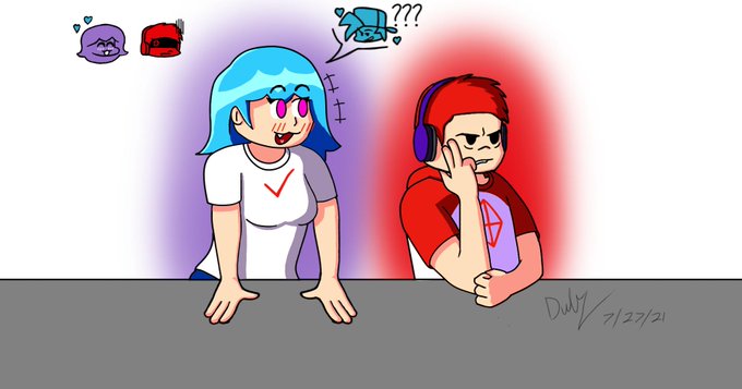 @bbsub3 's character, Sky, interacting with my character, Rival. Since Rival used to be close to Bf, Sky seems to be prying into their past lives, wanting to know every little detail there is. #fnf #fnfsky #fridaynightfunkinfanart #fridaynightfunkin #fnfrival #fnfmods