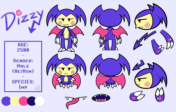 Dizzy is a tired imp who isn’t nearly as enthusiastic or energetic as his best friend, Red. He always looks annoyed (and often is) but he’s pretty chill once you get to know him. He can change into a smaller “Compact” form (which looks exactly how he did as a kid)