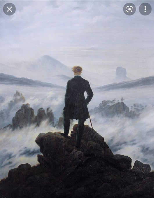 This composition of the onlooker being incorporated into the painting is of course most famously seen in Friedrich's 'Wanderer above the Sea of Clouds' from the 19th c. The use of open and eventful skyscapes in this narrative ofc comes from Surrealism and Dali.