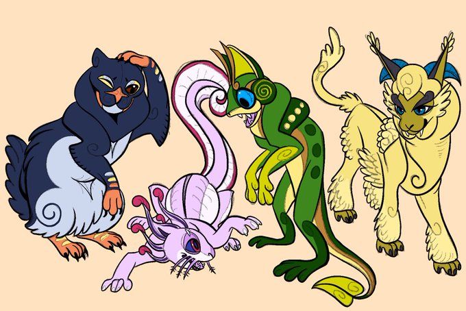 Healers and their healers in the making, Pang (Penguin foo-cat), Axol (axolotl foo-cat), Leap (Frog foo-cat), Shewe (sheep foo-cat)