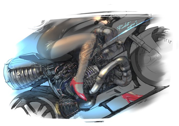 仕事は制約がメチャメチャ多いからそれらをぶっ飛ばして、金属の塊みたいなバイクをデザインしてみたくなって…ハンドガン・コンセプトみたいの描いてみました。レールガンとか装備して前方を蹴散らせながら走る感じ(笑)