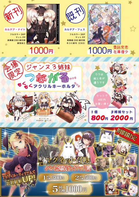 【1日目東5ミ13a】イレブンナインお品書きです。16名参加のFGO合同画集とグッズセットがあります!