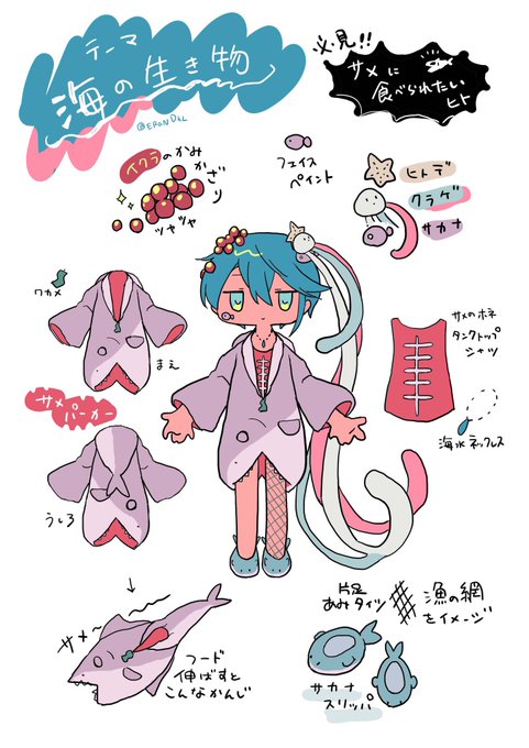 初めてファッションイラストというものを描きました! きっかけは学校の課題ですが、色々引き算しながら考えるのが楽しかったです。 服とかサメとか好きな人は是非じっくり見ていってください🦈‼️