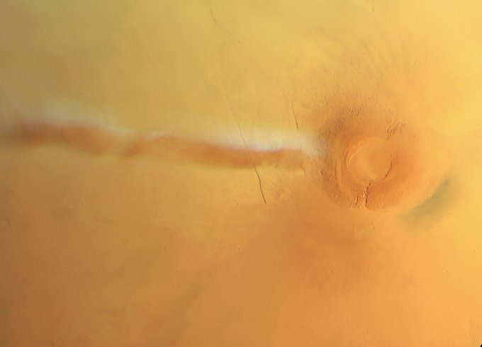 Awesome high-resolution view from ESA’s #MarsExpress of the curious cloud formation that appears regularly in the vicinity of the Arsia Mons volcano on #Mars 👉 https://t.co/j6N2XFYQzi