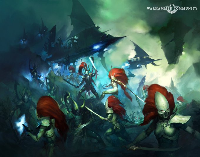 I think this is probably my most favourite piece of 40K art in the last decade... Assassination attempt on Asdrubael Vect. The segmented armour, the helms and the shiny blades held in a stabbing grip.. So much subtle detail that speaks volumes! 🙏 #warmongers #drukhari