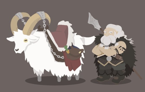 ドワーフのウービンくんと巨大山羊のオリフくんです。山の下の王国からウォーターディープ山羊に乗って人参かじりながらまったり旅してきました。