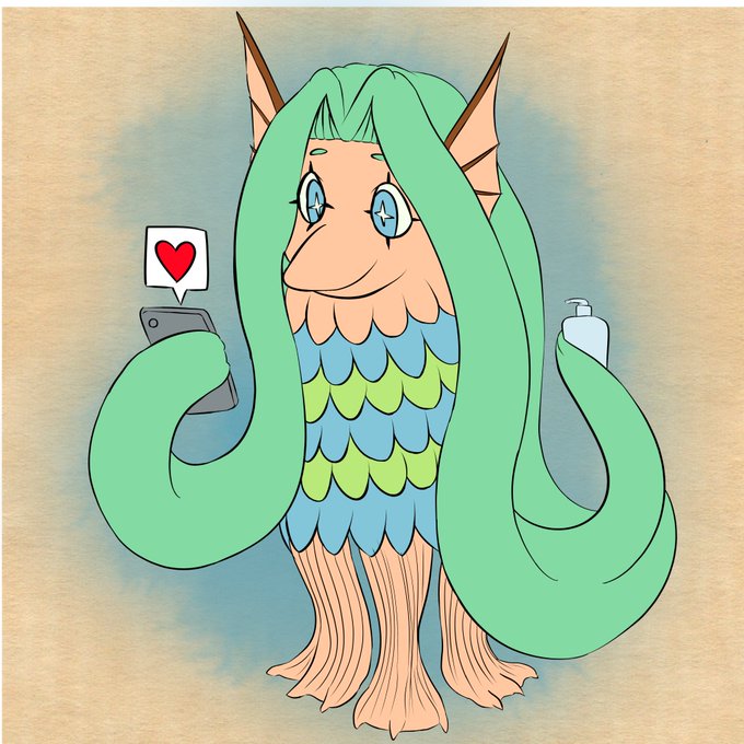 Amabie Update! Now shaded and corrected. For those who don't know this Yokai has been popular on social media promoting good sanitary practices in the face of Corona. Here she is happily faving another Amabie pic. Hope you guys like her! #yokaimarch #yokai #amabie #WashYourHands