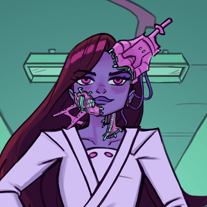 Cyberpunk fashionista, she has it all: translucent skin, random bullshit coming out of her head, teal, purple and magenta color theme! #digitalart #cyberpunk