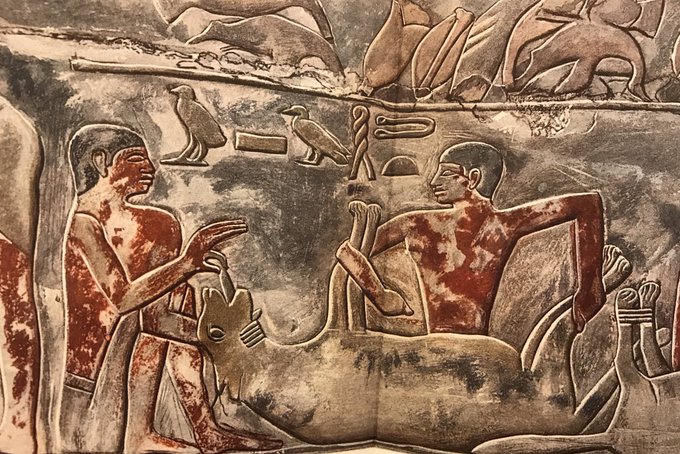 1936 publication of Mereruka & family’s tomb included the most beautiful watercolours inc this unusual scene captioned with hieroglyphs as fattening hyena. More of Joseph Lindon Smith’s artwork on @mfaboston https://t.co/9qeKkIfpV5