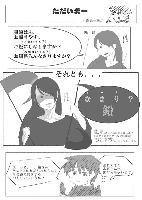 Pの形だか、bの形だか分からない鎌持った死神設定のなまりちゃん。いろんなところのなまり(方言)使う…とか。 #元素擬人化 #鉛
