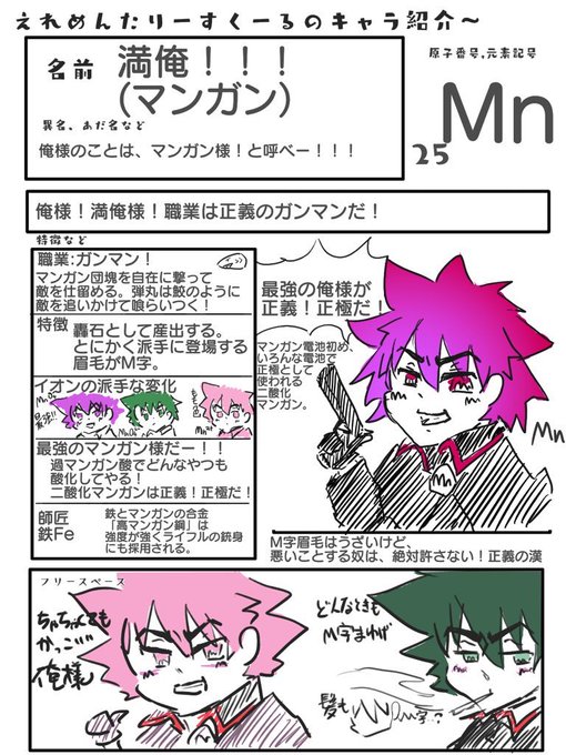 俺様満俺! マンガンの漢字表記は満俺! ガンガンの俺様キャラ。職業正義のガンマン!マンガン団塊撃ってくる。イオンの価数で髪の毛が変わる!カッコつけ。 #元素擬人化 #マンガン