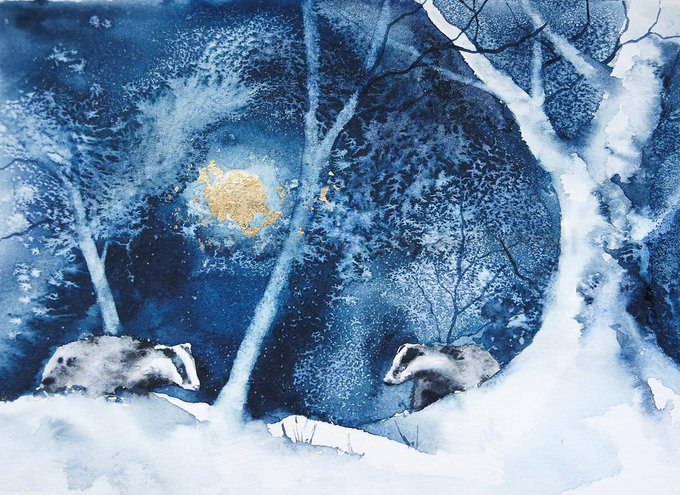 #watercolour #winter #woodland #trees #landscape #badger #snowy #BigArtBoost #thedailysketch #devon #snowday #wildlifeart #wildlifeartist #painting #art #brushstroke #painting #wildlife