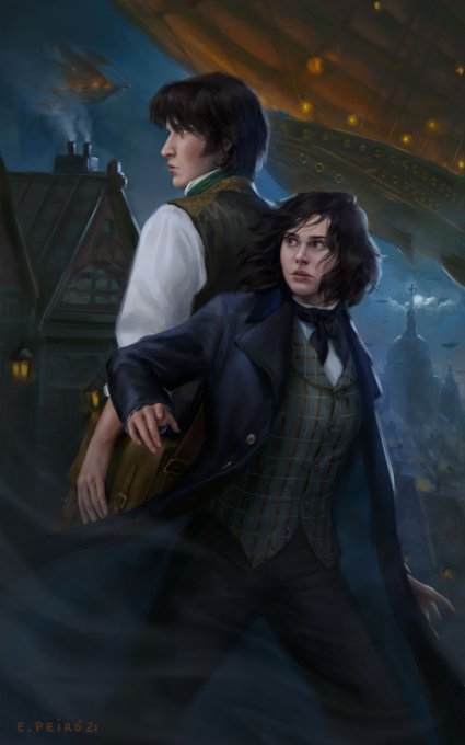 This one had to be a bit different than the others, brighter, the composition inspired by romantic novel covers. They are both wearing elegant matching outfits and dancing in front of Buckinham's palace. The zeppelins and the aether pistol give it the twist of fantasy.