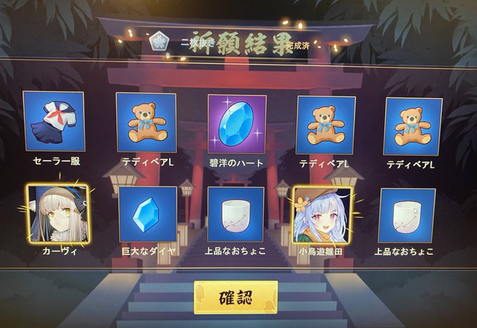 師匠がノリでガチャやったから私もノリで10連やったらカーヴィ手に入って歓喜! ゴミ処理した後チケット一枚の単発でまたキャラ来てツモ運鬼がかってたw