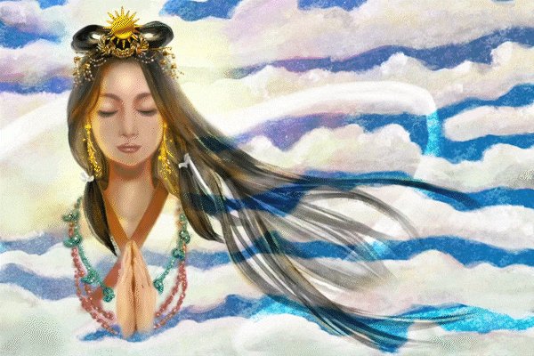 元の図版の雲間に光を見たように感じ、お天道様=天照大御神を描きました。