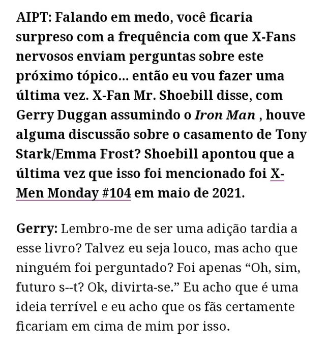 Quando questionado sobre o famigerado casamento entre Emma Frost e Tony Stark, o escritor Gerry Duggan foi bem direto ao afirmar que acha uma idéia terrível, e que os fãs também não gostariam de ver essa união acontecer. Concordam com o escritor?