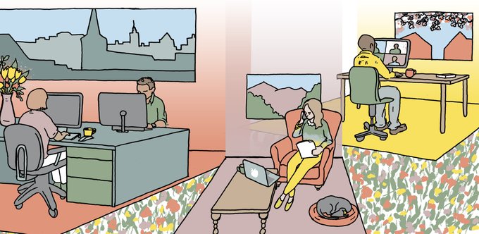Illustration for a remote business breakfast invitation. A hybrid work model with some spring colour.