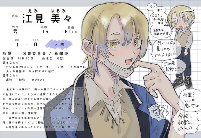 【@sumer_CT】こちらの企画に参加させて頂きます☀️ 初めての学園生活に胸膨らませている病弱男子です。関係真っ白❗️いっぱい遊んでくださると嬉しいです😃よろしくお願いします❗️ #夏街_CS #夏街_人間 #夏街_1年A組 #夏街_図書委員会 #夏街_新聞部