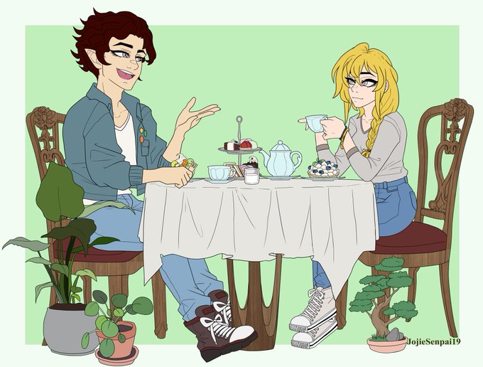 I commissioned @JojieSenpai_18 for this artwork of my half-elf Edmer and the Aasimar Solly sitting and having a luncheon together. They're both so cute together.