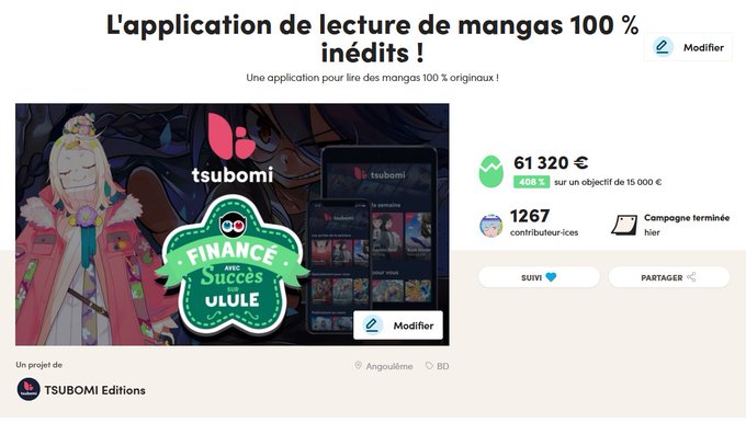 Hier soir, TSUBOMI, l'appli/maison d'édition de mangas 100% originaux a fini sa campagne Ulule avec BRIO🥳