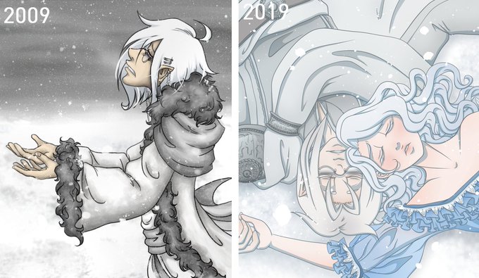 it's really satisfying to see the progress between these two pieces. they're almost ten years apart, how wild is that? december 2009 and jan 2019. autticus, sadness and snow are all things that just go together and i'll never get tired of drawing it.