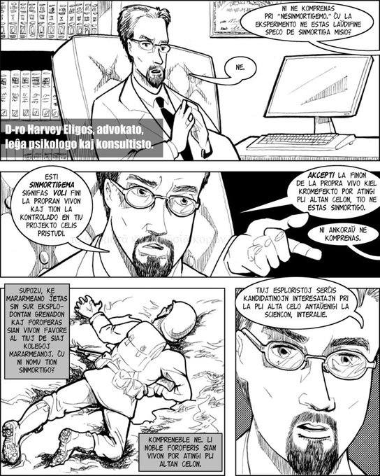 Logaĵo — 31-a paĝo. La spertulo pri etiko klarigas ĉion. #Esperanto #webcomic @MPodcastio notu bone: lipharojn.