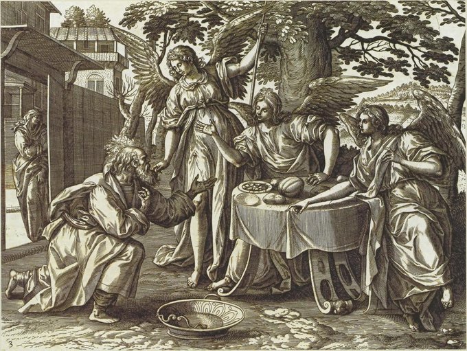 Бог является Абрахаму в образе трех Ангелов, которые предвещают ему рождение сына. Anonym, 1585 #exclusive_estetico