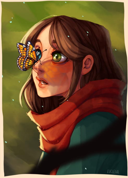 Painting réalisé en décembre dernier pour @Nihibus, avec un portrait de son personnage Emëlys, une intelligence artificielle inachevée qui a tout à apprendre de notre monde🦋