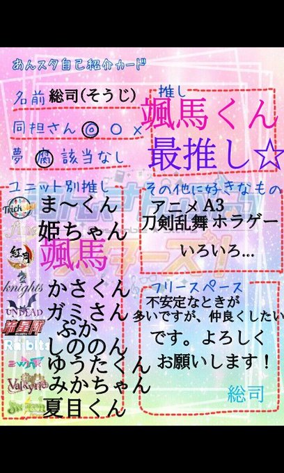 #Twitter上にいるあんスタ好き全員と繋がるのが密かな夢だったりするのでとりあえずこれを見たあんスタ好きはRTもしくはフォローしてくれたら全力でフォローしに行きます #あんスタ好きさんと繋がりたい #あんスタ好きな人RT