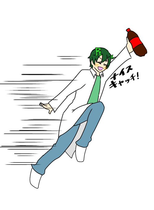 キャッチ若干修正版とコーラボトルをついに開ける博士 キャップ開けるの苦戦するのも面白いかもしれない…描くか…まず寝よう #リィの研究所