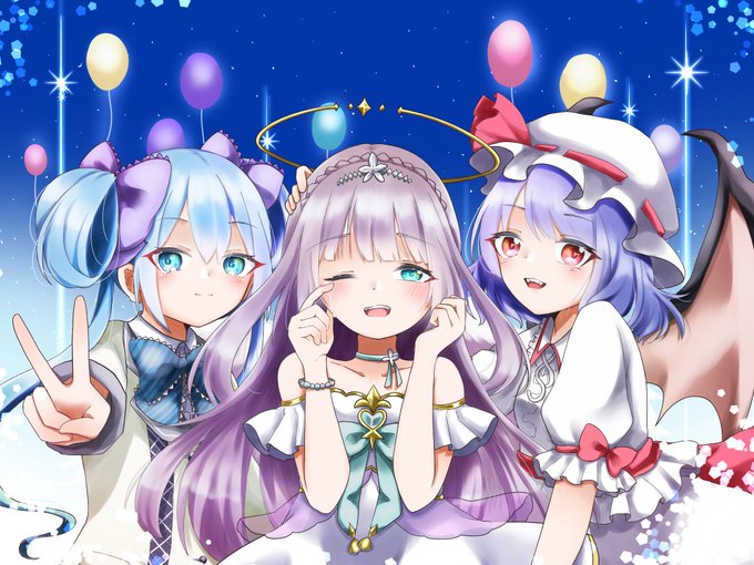 れまいれの舞神取得おめでとうの絵!! 要望で仲のいい、のんくんさんとハルさんの推しの有栖ちゃん&レミリアと、れまいれの推しのミカちゃんを描きました〜🙌 背景はBelievThe Rainbowイメージ! #maimai #maimai_art